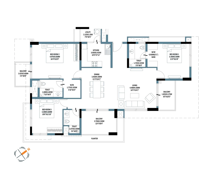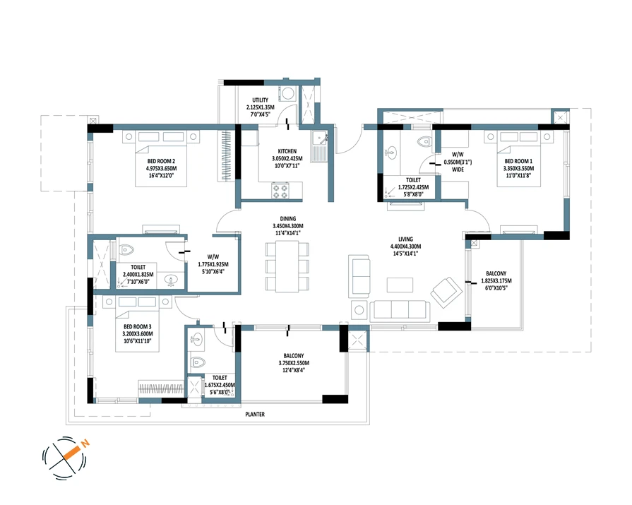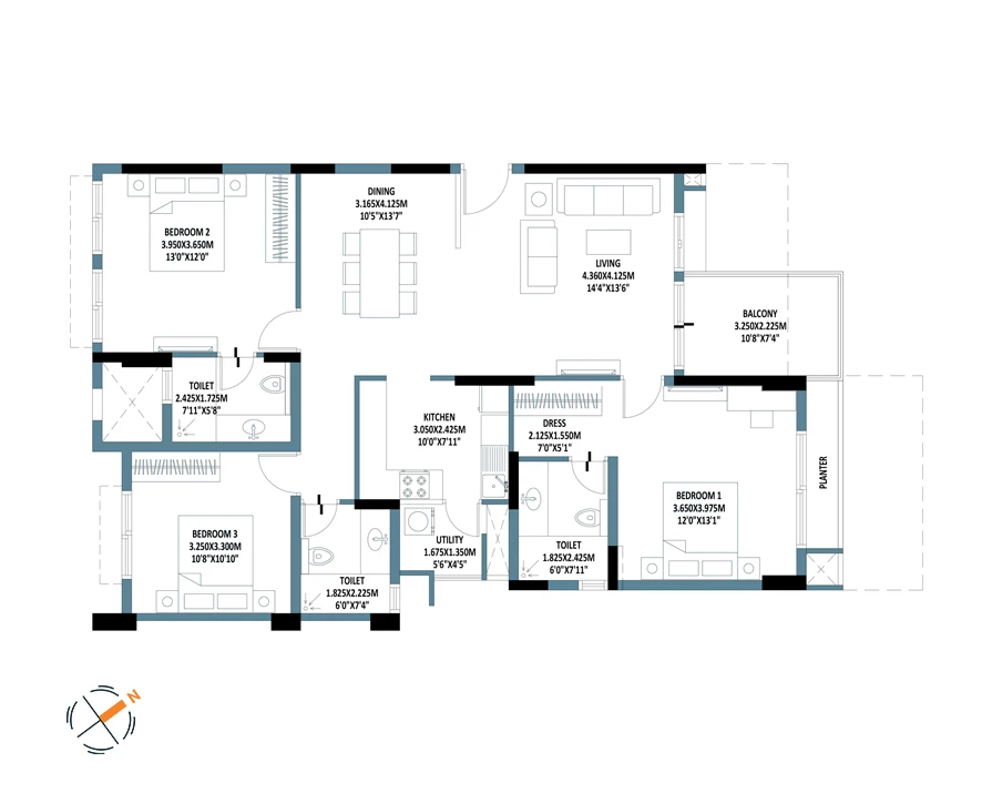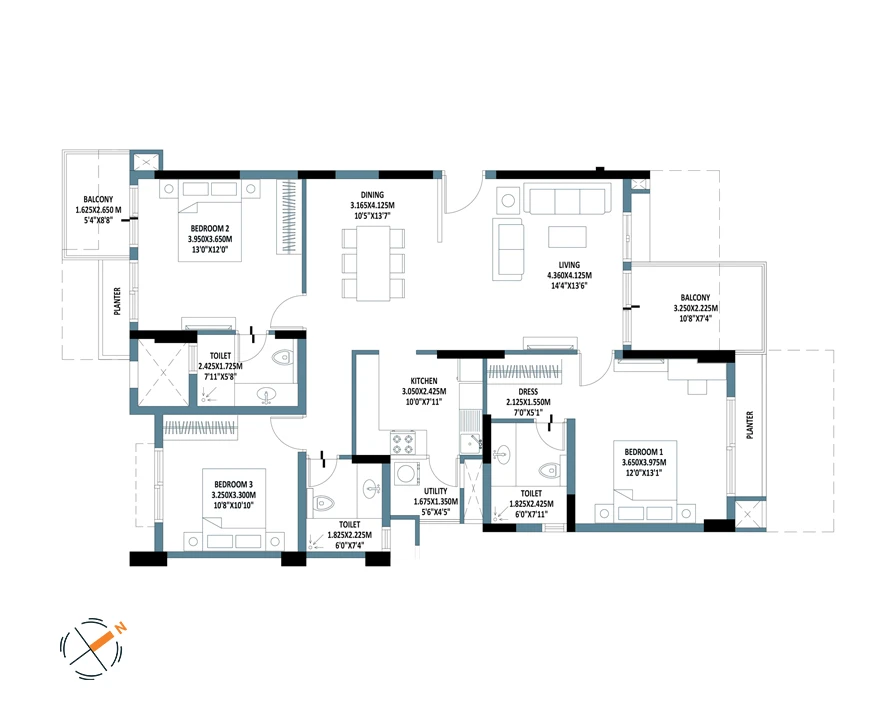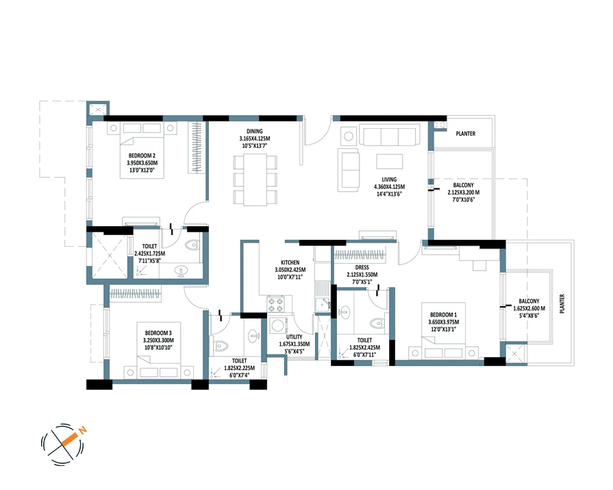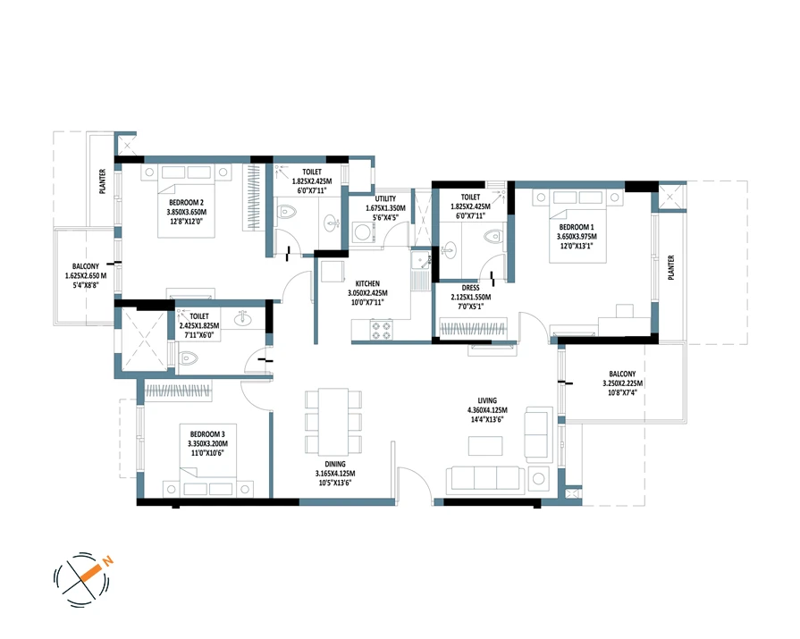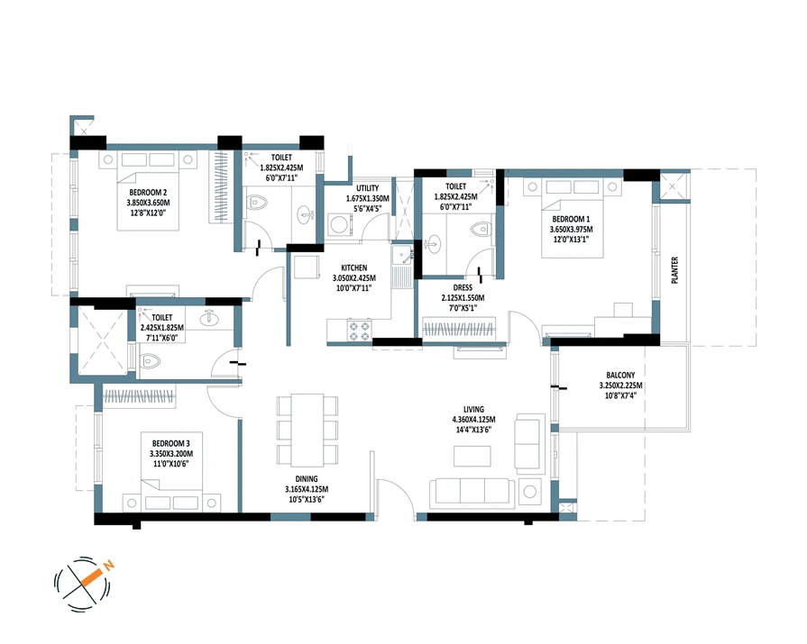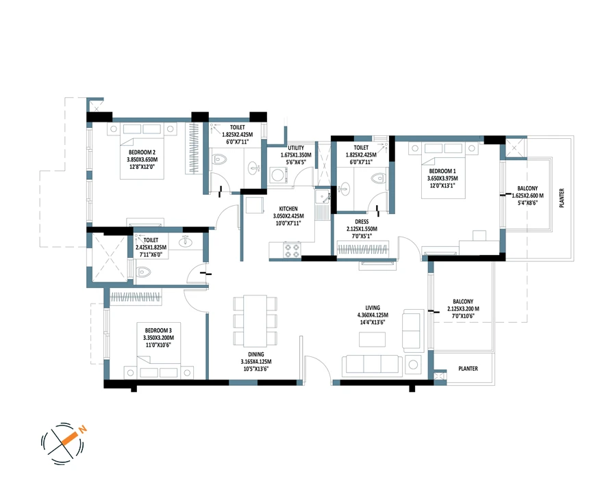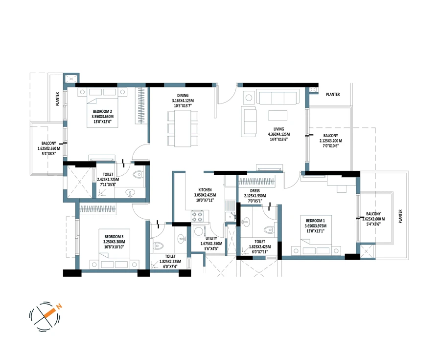 This Vaastu-compliant unit, located on the first floor of Block B, features three bedrooms, two of which include attached bathrooms. Thoughtfully designed, it offers two spacious balconies and planters strategically placed adjoining the living area and master bedroom respectively, creating a serene and relaxing environment.
