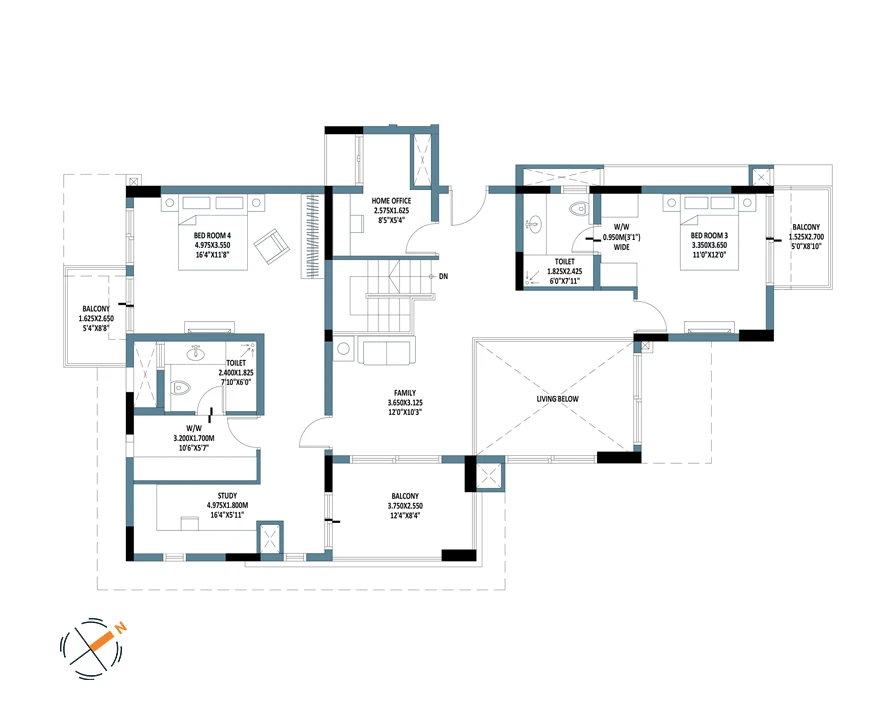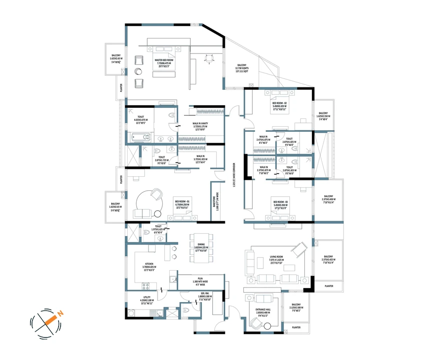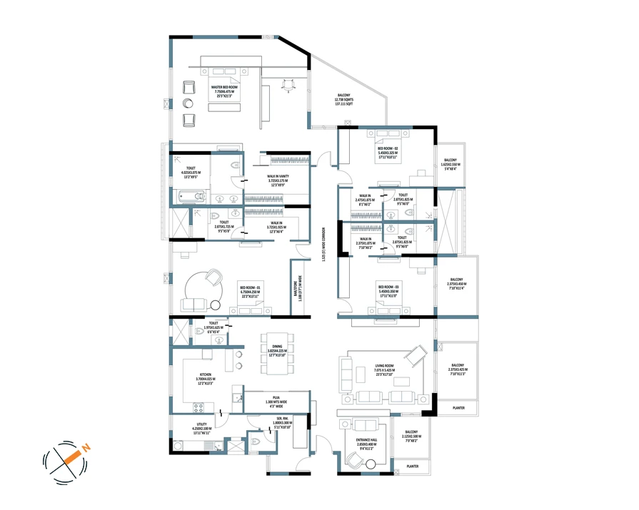 This 4BHK Vaastu-compliant unit ranks among the three largest at BCM Panache. With over 550 sq. ft. of living and dining space, it is located on the first floor of Block C. The unit boasts four generously sized bedrooms, each with an en-suite bathroom and a walk-in wardrobe. Additionally, it includes five balconies, providing ample space for relaxation and fresh air.